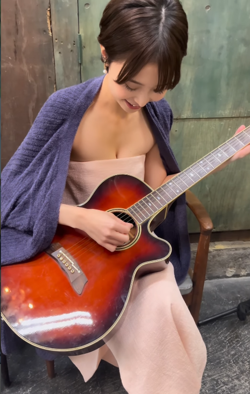ギターを弾く渡邊渚さんのインスタリールですがギターより谷間を見ちゃいますね!すみませんw肩出しのドレッシーな姿にもエロスを感じます(2026/01/24更新)